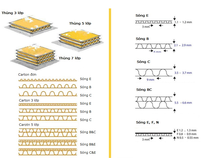Về thông số kỹ thuật, định lượng giấy,… thì mỗi loại sóng sẽ được sản xuất khác nhau, cụ thể: